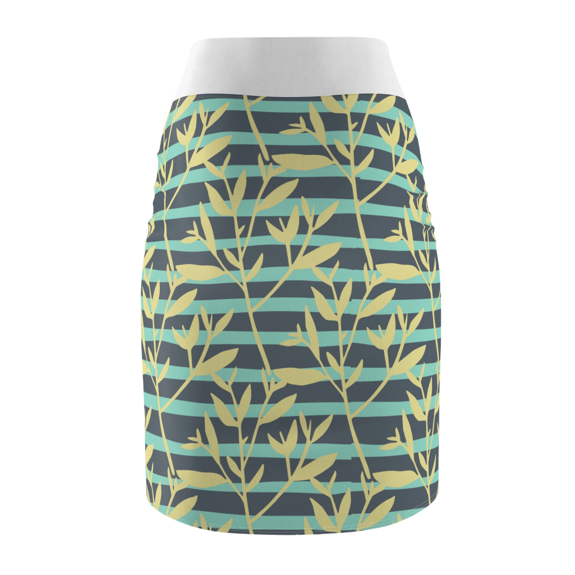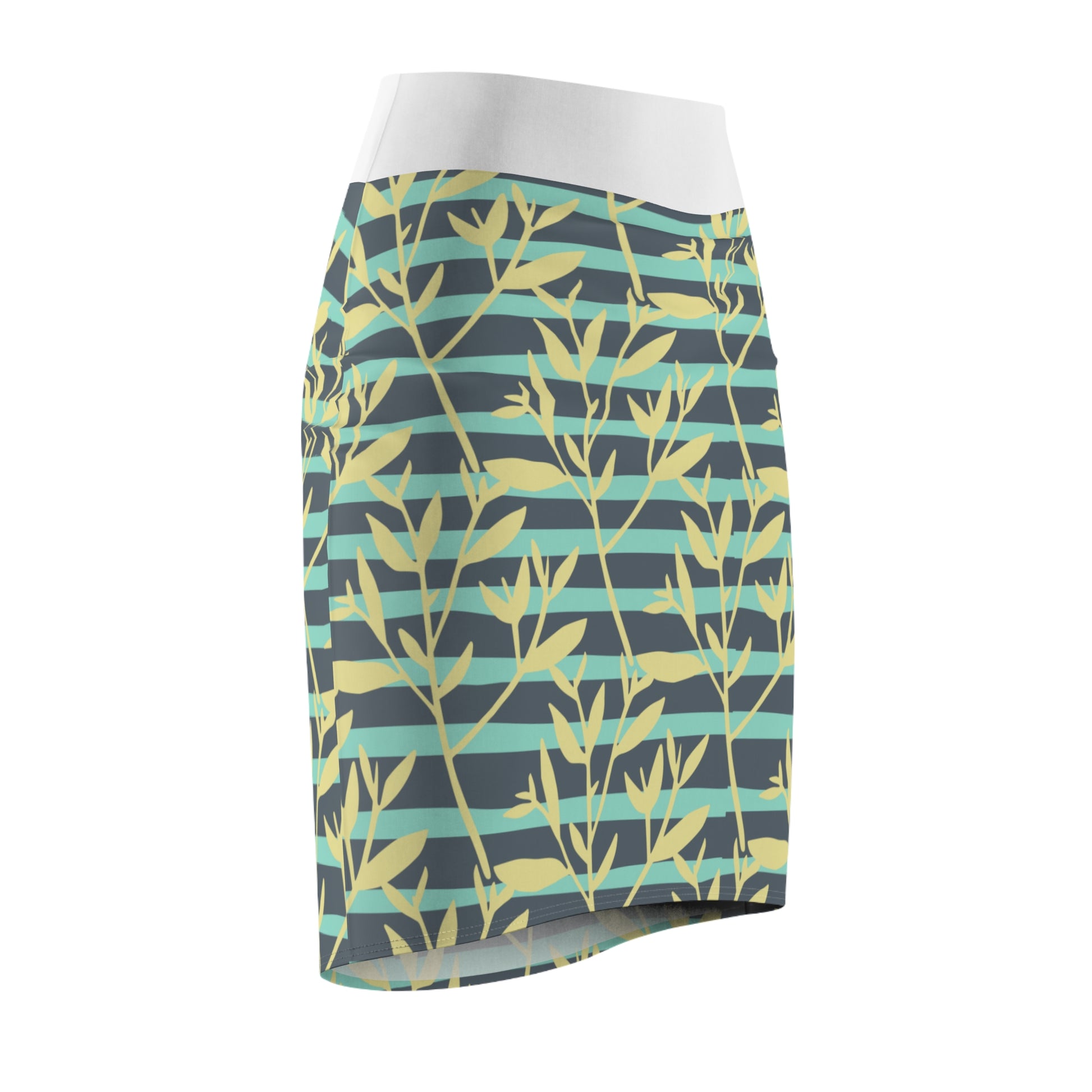 Floral Stripe Pencil Skirt — Teal & Yellow Leaf Pattern, Women's AOP
